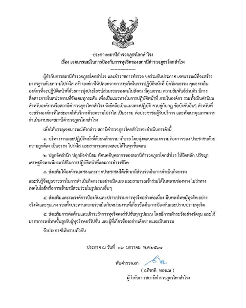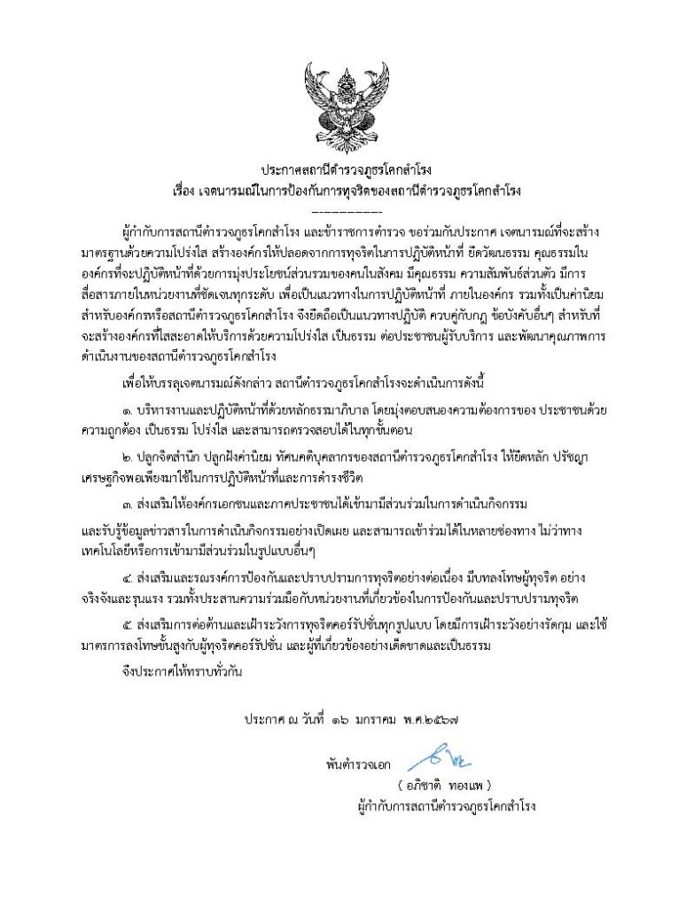 สถานีตำรวจภูธรโคกสำโรงประกาศเจตนารมณ์ในการป้องกันและปราบปรามการทุจริต 16 มกราคม 2024 โดย admin_Khoksamrong / ข่าวภารกิจผู้บังคับบัญชา เมื่อวันที่ 16 ม.ค. 67 พ.ต.อ.อภิชาติ ทองแพ ผกก.สภ.โคกสำโรง ได้มีการประกาศเจตนารมณ์ ในการป้องกันการและต่อต้านการทุจริตของสถานีตำรวจภูธรโคกสำโรง โดยได้มีการเรียกข้าราชการตำรวจสถานีตำรวจภูธรโคกสำโรงทุกนาย ชี้แจงและอบรมมาตรการการป้องกันทุจริต รวมทั้งออกเป็นคำสั่ง มาตรการ ควบคุมความประพฤติและวินัยข้าราชการตำรวจ ในทุกหน้างานที่เกี่ยวข้องตามคำสั่งสถานีตำรวจภูธรโคกสำโรงที่ 31 / 2567